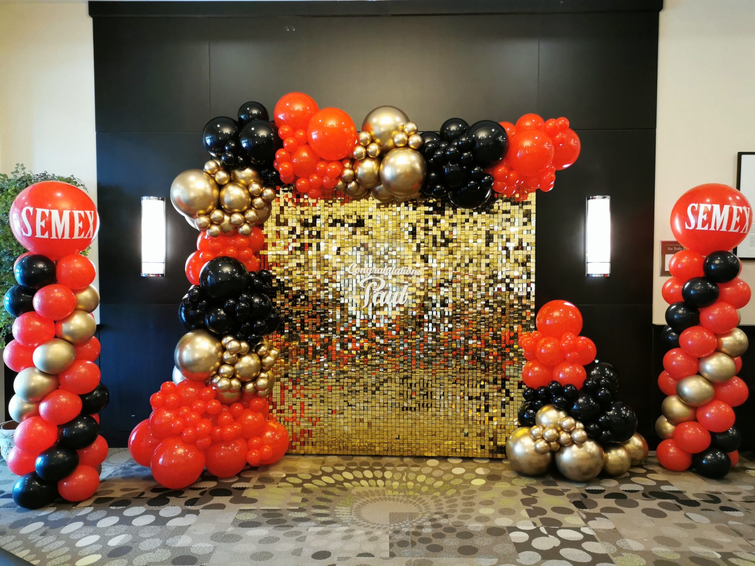 A corporate anniversary installation built for high-traffic spaces—celebratory, photo-forward, and cleanly executed from start to finish.